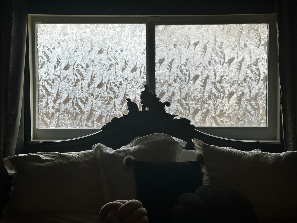 The privacy film on the window casts a soft silver glow that completely transforms the light and the view—it’s subtle but stunning. We’re holding off on laying down the new, brighter-toned rug until the work above the bed is complete. I’m also having double track curtains installed, with a custom-looking finish (I don’t know what to call it exactly, but trust—it’s going to elevate the entire wall).